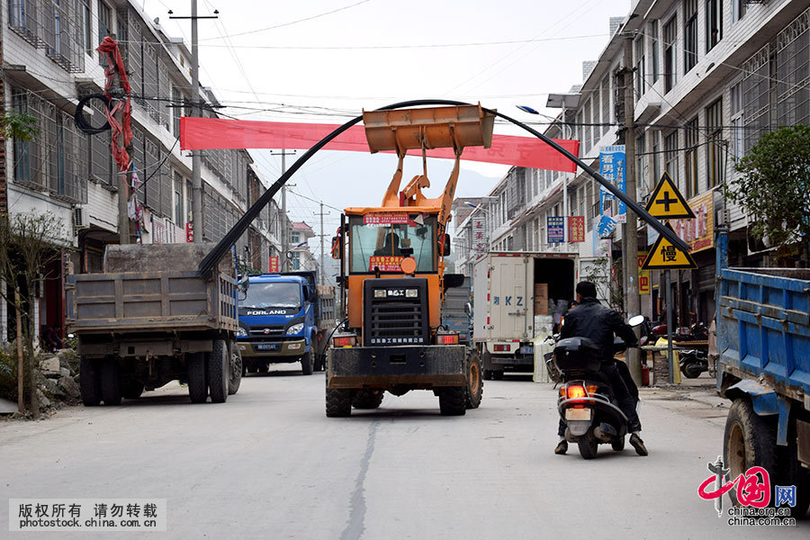 Am 19. November fährt ein Bagger auf einer Straße in Shuangfeng, Hunan – auf seiner Schaufel hat er einige schwere Eisenstäbe geladen.