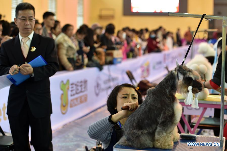 Das Foto vom 4. Dezember 2015 zeigt eine Kandidatinbei der Schönheitspflege ihres Hundes für den Haustier-Schönheitswettbewerb in Nanning, der südchinesischen autonomen Guangxi Zhuang Region.