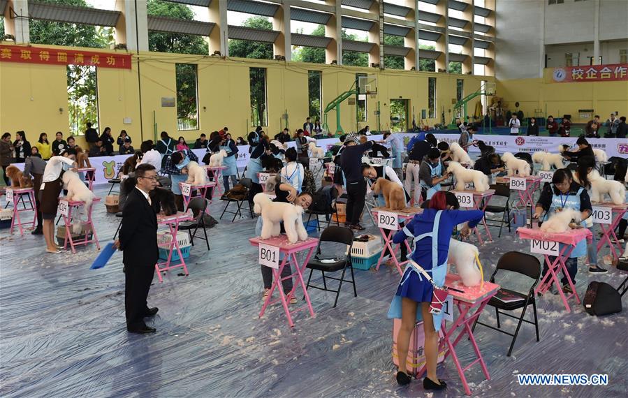 Die Kandidaten bereiten ihre Hunde für den Schönheitswettbewerb in Nanning vor. Foto vom 4. Dezember 2015.