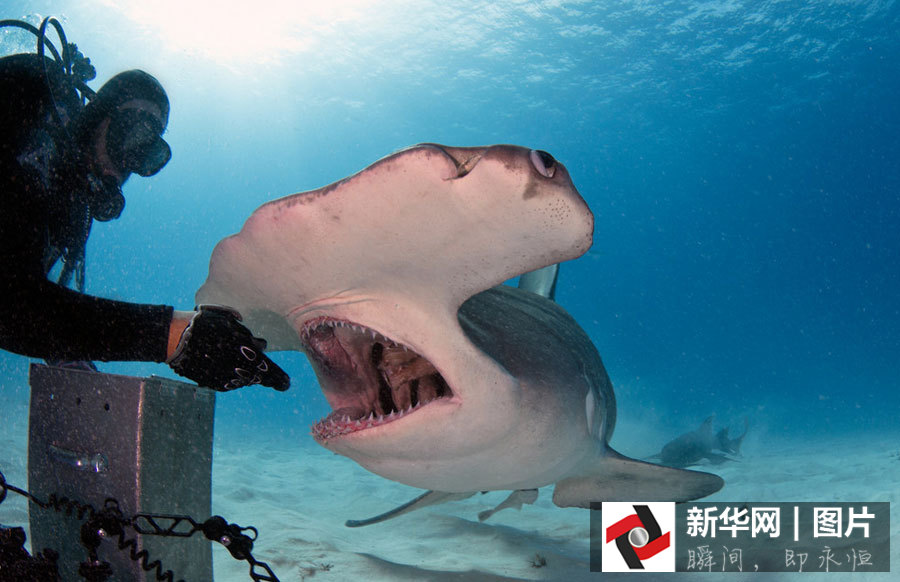 Die Haifische, die gut 6 Meter lang sind, sehen so sanft aus, wenn sie von Joe Romeiro gefüttert werden.