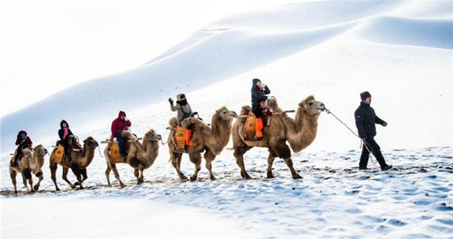 Die beiden bekanntesten Sehenswürdigkeiten von Dunhuang – die Mogao-Grotten mit den einzigartigen Wandmalereien und der Mondsichelsee zwischen den hohen Sanddünen – sahen nach dem Schneefall wie ein spektakuläres Landschaftsbild aus der Tuschmalerei aus.
