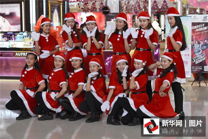 Einige chinesische Mädchen tanzen als Nikoläuse in einem Supermarkt.