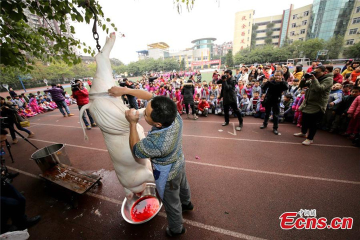 In einer besonderen Unterrichtsstunde an einer Grundschule im südwestchinesischen Chongqing habe ein Metzger gestern ein Schwein vor einer Gruppe von Schüler(inne)n zerlegt, um ihnen direkte Erfahrung in diesem traditionellen Volksbrauch zu vermitteln, berichtete die Chongqing Morning News.