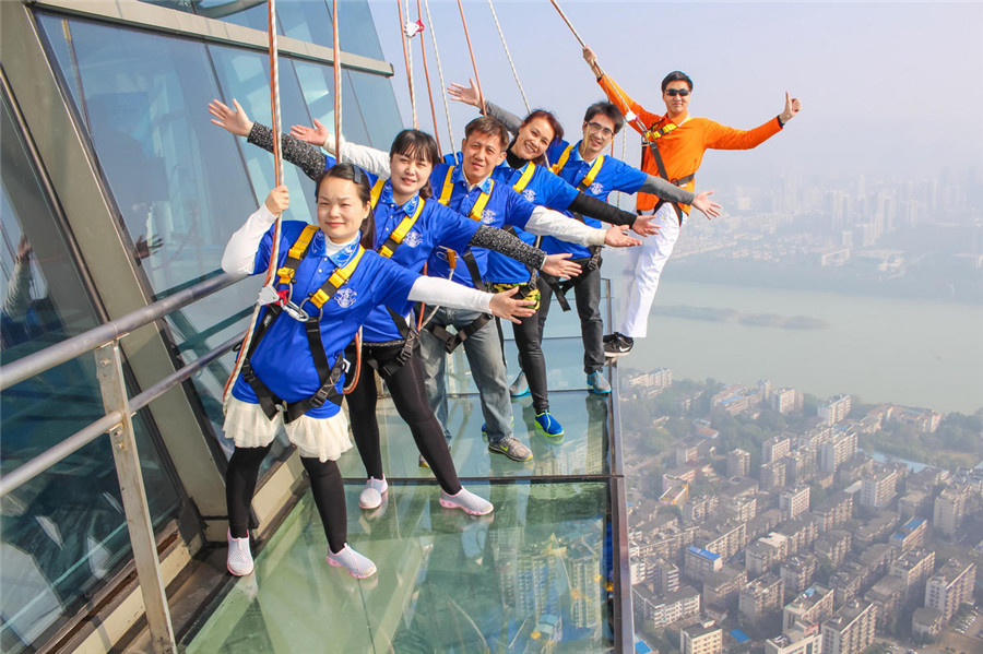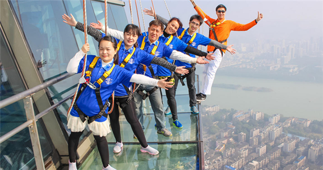 Touristen erleben einen atemberaubenden Spaziergang auf einem Glassteg an der Spitze eines 303 Meter hohen Gebäudes in Liuzhou im Südwesten Chinas. (Foto vom 27. Dezember 2015)