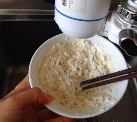 1. Das Mehl in eine große Schüssel geben; den Wasserhahn nur so wenig aufdrehen, dass das Wasser tropft; das Mehl mit Essstäbchen schnell umrühren und dann zu Flocken machen (siehe Bild).