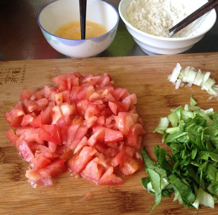 2. Das Ei umrühren, die Tomaten abwaschen und in kleine Würfel hacken; den Senfkohl abwaschen und in kleine Würfel schneiden; die Frühlingszwiebeln in dünne Streifen schneiden.
