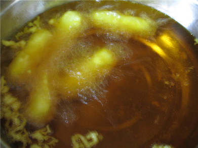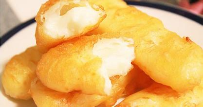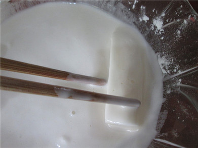 6. Den geschnittenen Milchkuchen zunächst in der Mehlmischung wenden, anschließend in heißes Öl geben und so lange frittieren, bis er goldbraun und knusprig wird.