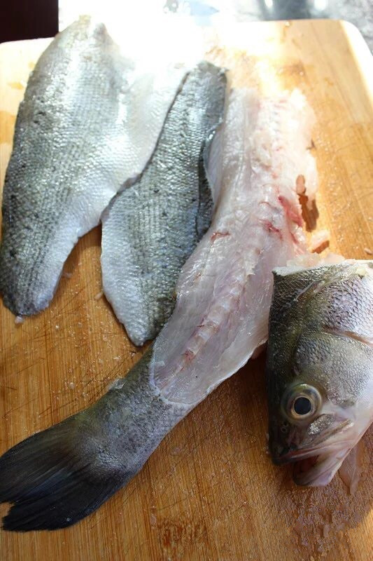1. Den Barsch köpfen und ausnehmen, Greten entfernen und den Fisch halbieren. Den Fischkopf und die Gräten braten, bis sie goldbraun sind. Danach Tofu steht nicht im Rezept! Hinzugeben und eine Suppe ansetzen. – Ein Fisch: zwei Gerichte.