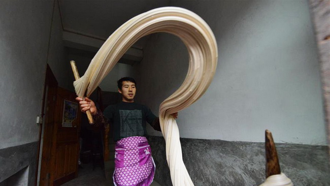 Ein Einwohner aus dem Kreis Yuqing zieht zuhause den karamellisierten Zucker, um „Matang“ herzustellen. (Foto vom 18. Januar 2016, He Chunyu, Xinhua)