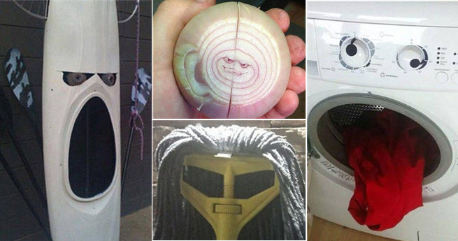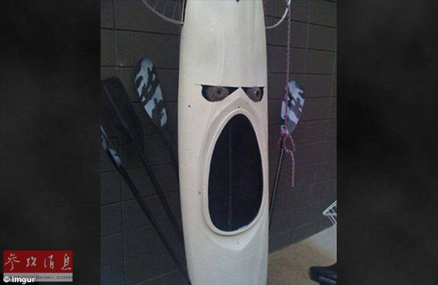 Ein Kanu lehnt an der Wand und "starrt" mit offenem "Mund" und großen "Augen" vor sich hin.