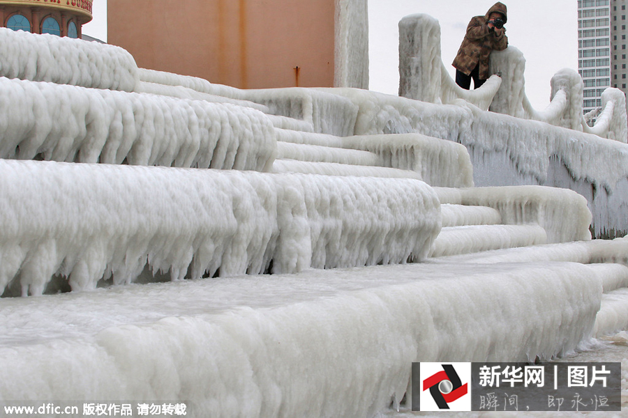 Andauernder Schneefall und eine Kältewelle in Yantai, der ostchinesischen Provinz sorgen für dickes Eis am Strand.