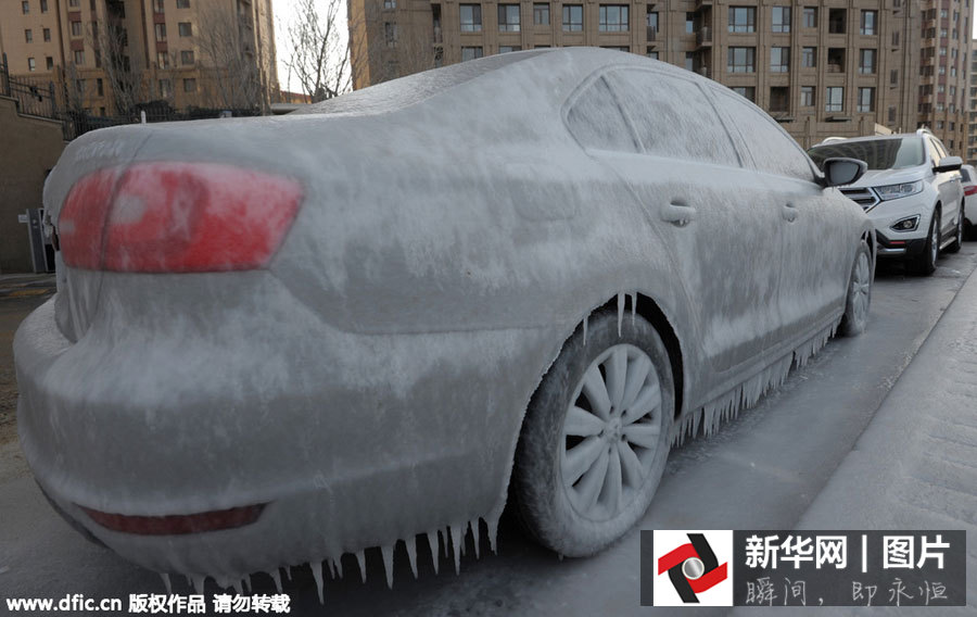 Ein Auto in der Küstenstadt Qingdao ist total von Eis umhüllt.
