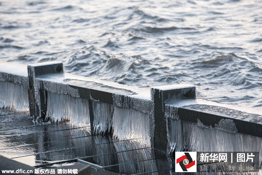 Steinbalustraden und Bänke am Westsee mit dichten Eiszapfen.