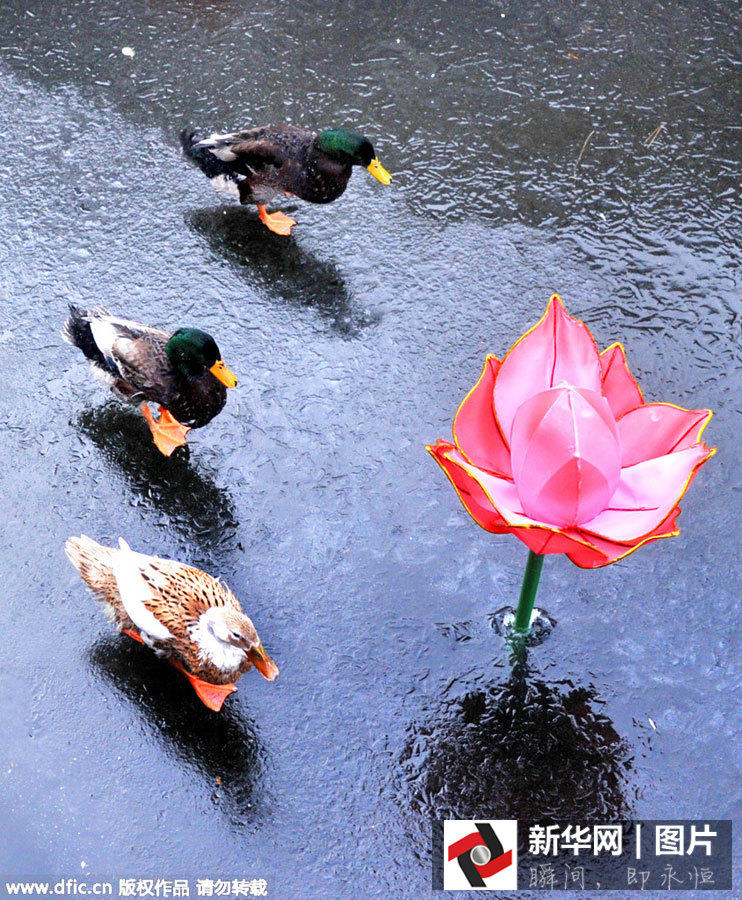 Ein paar Enten gehen über den eingefrorenen Lotusteich spazieren. Der 24. Januar war der kälteste Tag der Stadt seit 35 Jahren.