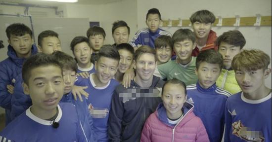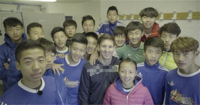 Gruppenfoto junger chinesischer Fußballspieler mit dem Barcelona Superstar Lionel Messi.