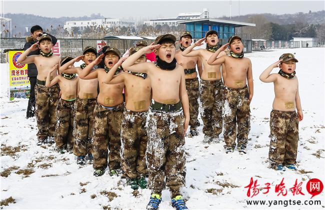 Kinder unterziehen sich am 1. Februar 2016 einem Training auf einem schneebedeckten Spielplatz in einem Winterlager in der Stadt Nanjing, der Hauptstadt der ostchinesischen Provinz Jiangsu. Dabei dürfen sie keine Oberbekleidung tragen.