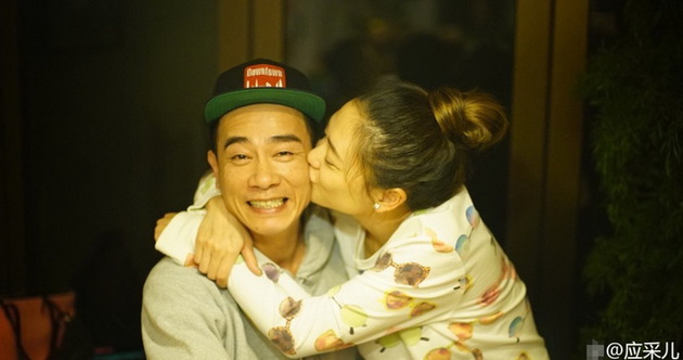 Die Schauspielerin Cherrie Ying küsst ihren Mann, den Schauspieler Jordan Chan auf die Wange.