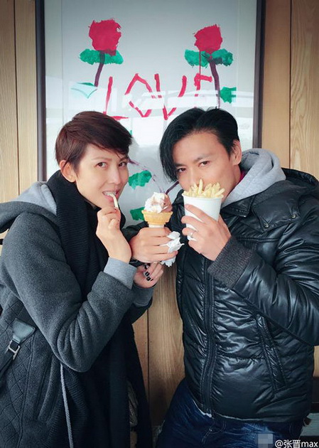 Das Ehepaar Ada Choi (links) und Zhang Jin essen Kartoffelchips. „Wir wünschen allen Geliebten, dass ihr in Zukunft Chips werdet“, scherzten die beiden Schauspieler auf Weibo. Im Chinesischen ist das ein Wortspiel: "Shu Tiao" bedeutet Chips, "Juan Shu" steht für Liebespaar.