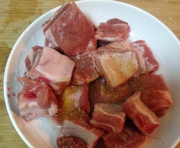 3. Schweinerippchen mit Salz, Hühnerbouillon, Zucker, Kochreiswein und Pfeffer marinieren und 20 Minuten ziehen lassen.