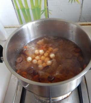 5. Anschließend Lotosnüsse und Kandiszucker hinzugeben und für weitere 30 Minuten kochen.