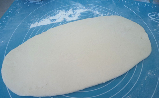 6. Den aufgegangenen Teig durchkneten und zu einer länglich runden Form ausrollen.