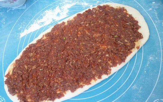 7. Die Fleischfüllung auf dem ausgerollten Teig verteilen.