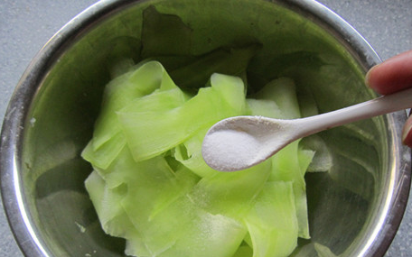 1. Den Spargelsalat (Latuca sativa var. angustana) waschen, schälen und mit einem Hobel in dünne Scheiben schneiden.