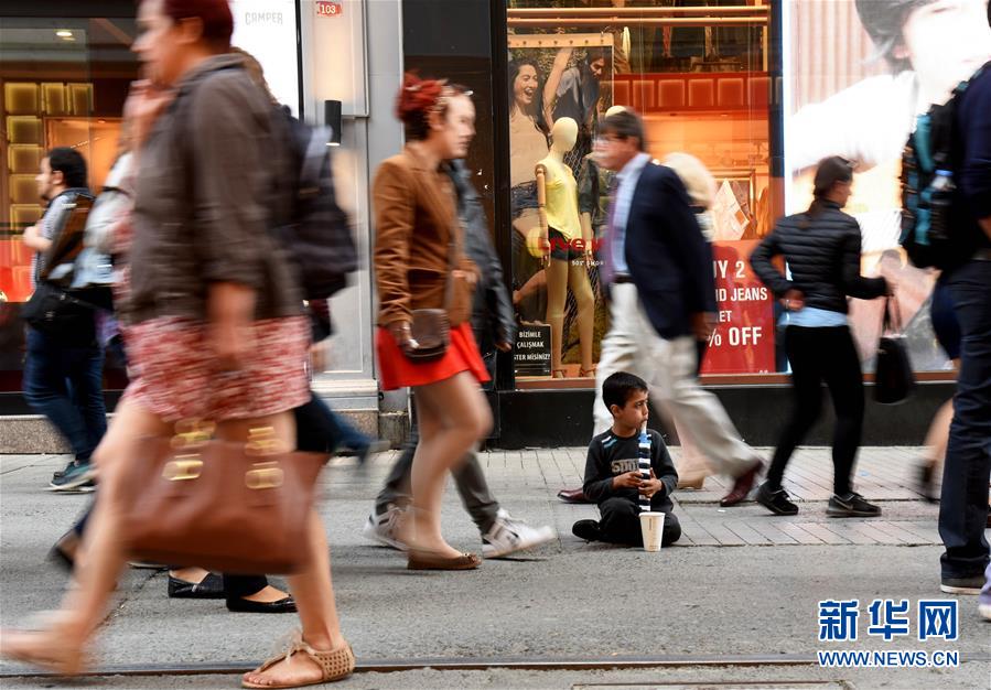 Ein Flüchtlingsjunge bettelt auf der Straße in Istanbul und spielt Flöte. Die Fußgänger gehen an ihm vorbei.