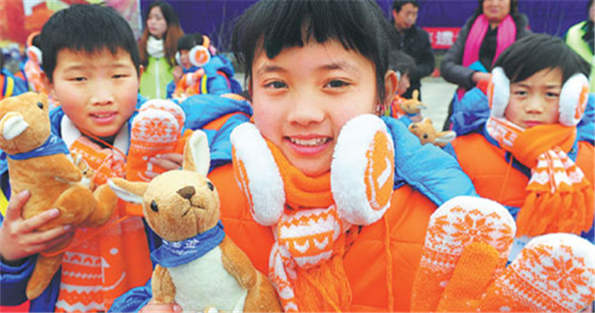 Benachteiligte Kinder erhalten Winterkleidung bei einer Veranstaltung, die lokale Unternehmen finanzierten, Fuyang, Provinz Anhui, 10. Januar 2016.