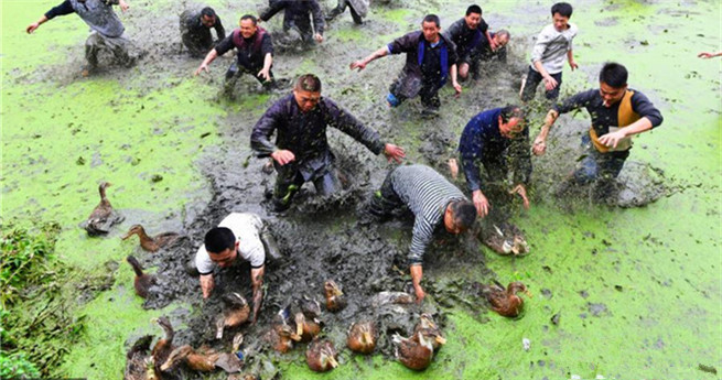 Landwirte fangen am 24. März 2016 während eines traditionellen Volksfestes in dem Autonomen Bezirk Qiandongnan Miao und Dong in der südwestchinesischen Provinz Guizhou Enten.