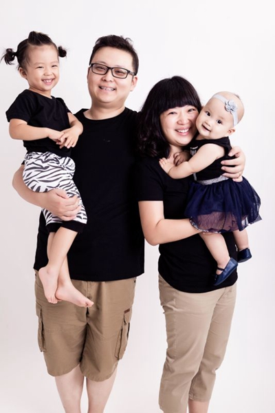 Der Beijinger Yu Cheng und seine Frau Jiang Lili tragen ihre Töchter im Alter von einem beziehungsweise vier Jahren.