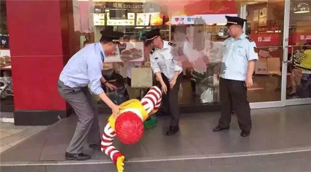 Für die Erhaltung des Stadtbildes und die Sicherheit der Fußgänger wurde am Sonntag vor einer McDonald’s-Filiale eine illegale Außenwerbung von Ordnungsbeamten entfernt.