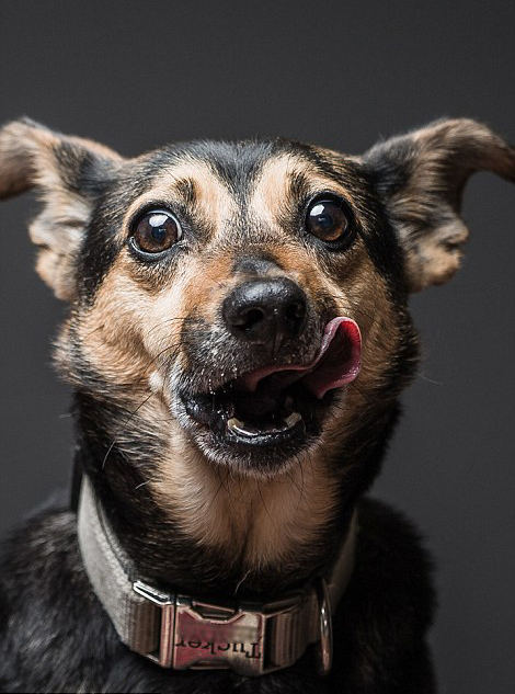 Mitunter sind Hunde zu einer imposanten Mimik fähig, insbesondere dann, wenn sie ihren Lieblingsleckerbissen Erdnusspaste genießen.