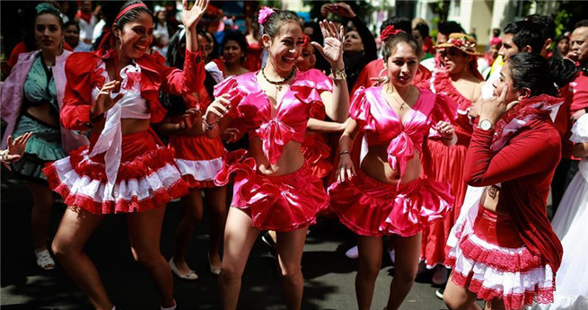 Die Frauen aus der chinesischen Stadt Yangzhou treten mit ihren traditionellen Kostümen bei dem Straßenumzug am 15. Mai auf.