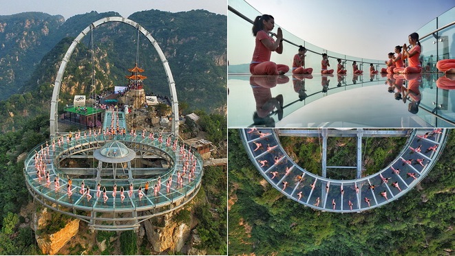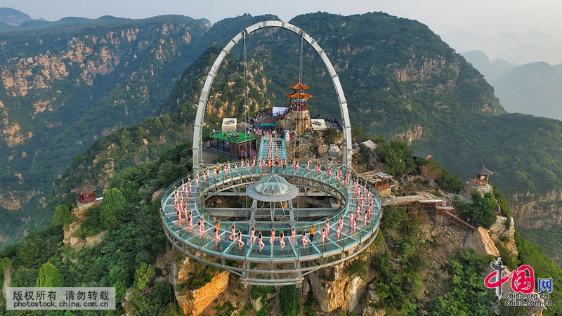 Heute wird der Internationale Tag des Yoga gefeiert. Bereits gestern, also Montagmorgen, hat eine Gruppe Yoga geübt auf der UFO-förmigen, gläsernen Aussichtsplattform im Urlaubsgebiet Shilinxian im Beijinger Vorort Pinggu. Die Plattform gilt als die größte der Welt. Sie ist 700 Meter über dem Meeresspiegel angelegt und hat eine Nutzfläche von 415 Quadratmetern. Durch den transparenten Boden genießt man einen atemberaubenden Blick ins tiefe Tal. Auf dieser Plattform, auf der Schwindel und Angst bei normalen Menschen häufiger vorkommt, versuchen die Sportler unterschiedliche schwierige Bewegungen zu machen. Nach Angaben von Chen Yongqi, dem Yoga-Trainer, der diesmalige Veranstaltung organisiert, haben insgesamt 150 Personen, die entweder Trainer oder Amateure sind, daran teilgenommen, wobei die ältesten schon 60 Jahre alt sind. Auf dieser Plattform in einer wunderbaren Umgebung könne man bei den Übungen Geist und Körper besser mit der Natur in Einklang bringen. Mit diesem Event wollten sie ihren Respekt vor ihrem gemeinsamen Hobby zeigen, so der Trainer.