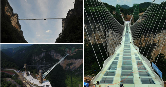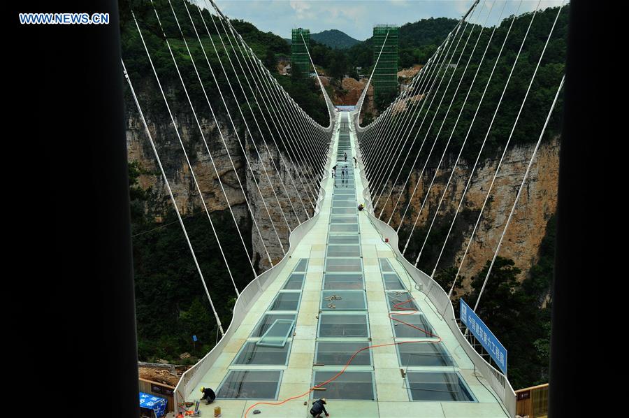 Die Glasbrücke über den Grand Canyon of Zhangjiajie National Forest Park in der südchinesischen Provinz Hunan kann bald von Besuchern betreten werden. Die Brücke, deren Steg vollständig aus Glas besteht, ist 430 Meter lang, sechs Meter breit und schwebt 300 Meter über dem Tal, rund 800 Personen kann sie tragen. Die Bauarbeiten sind in die Endphase getreten, nach einer abschließenden Sicherheitsüberprüfung wird die Glasbrücke für die Touristen zugänglich sein.
