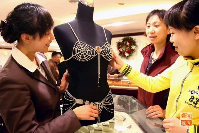 Eine Verkäuferin zeigt in einem Goldladen in Jinan, der Hauptstadt der ostchinesischen Provinz Shandong, einen 18 Karat Goldbikini. (Foto am 27. April 2006)
