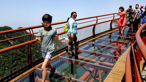Im Sommer zieht es jährlich zahlreiche Touristen in den nationalen Forstpark Shaohuashan in der nordwestchinesischen Provinz Shaanxi. Dieser wartet mit einer insgesamt 455 Meter langen Brücke auf, die auf einem zweieinhalb Meter breiten und 69 Meter langen Abschnitt mit gläsernem Boden einen einzigartigen Blick über den Park bietet.