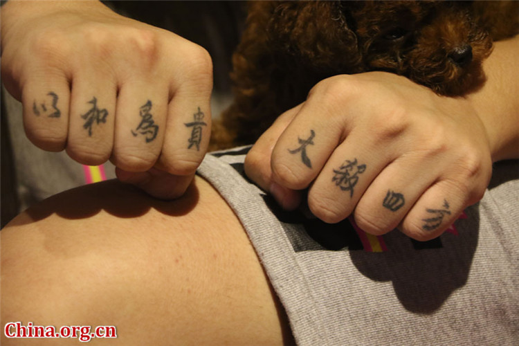Das Hände-Tattoo von Zhu Zhuo. Es heißt: „Wahre die Harmonie und sei für alle unbesiegbar“.