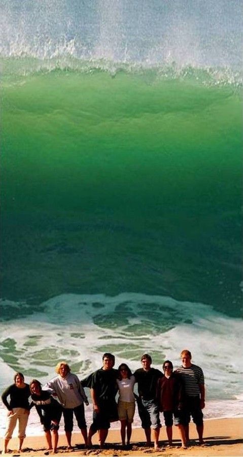 Zwei Sekunden vor den seismischen Meereswellen in dem Indischen Ozean 2014 machten diese Touristen noch ein Gruppenfoto. Hinter ihnen erhoben sich bereits sehr hohe Wellen.