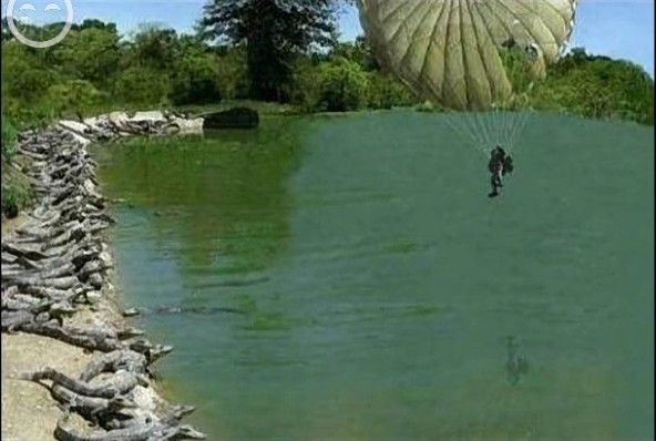 Ein Fallschirmspringer wird in einem Teich landen, der von zahlreichen Krokodilen umgestellt ist.