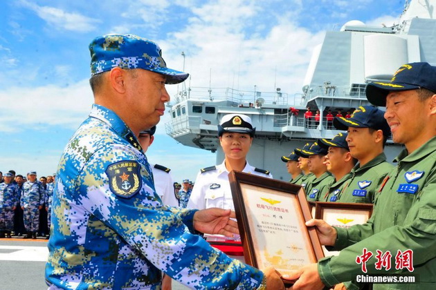 Einem Piloten wird vom Vize-Kommandeur der chinesischen Marine Ding Yi die Qualifikationsurkunde verliehen.