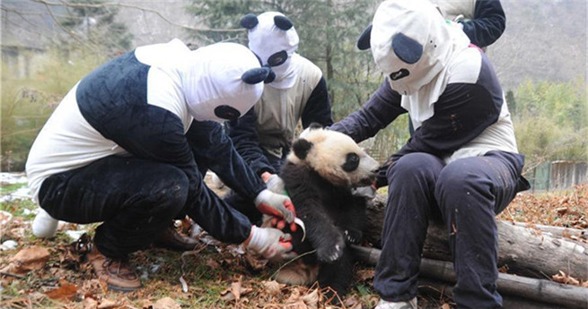 Das Archivfoto vom 27. Januar 2016 zeigt Mitarbeiter, die an einem Riesenpandajungen während eines Wildnis-Trainings in der Hetaoping Wild Training Base in der südwestchinesischen Provinz Sichuan einen medizinischen Check durchführen. Mit der steigenden Zahl an Riesenpandas, die in Gefangenschaft gezüchtet und gehalten werden, hat China 2006 begonnen, Pandas aus der Gefangenschaft in die Wildnis zu entlassen, um die genetische Vielfalt und Qualität der Spezies zu verbessern.