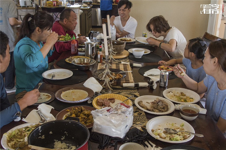 Mitglieder einer chinesischen Reisegruppe beim Dinner auf einem Bauernhof.