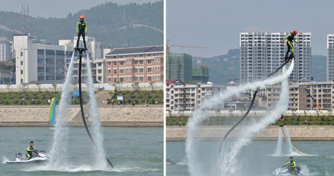 Ein Mann steht auf einem Flyboard, das über einen Schlauch mit einem Jetski verbunden ist und durch dessen Wasserstrahl-Rückstoß angetrieben wird. Dadurch kann der Sportler in die Höhe steigen, in der Luft schweben und manövrieren.