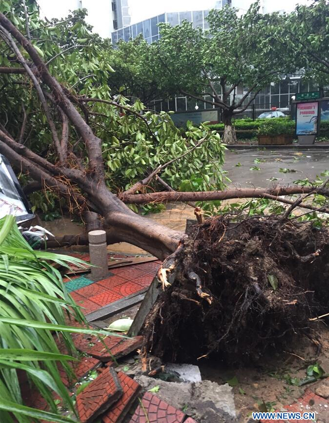Ein vom Taifun umgestürzter Baum in der Stadt Xiamen in der südostchinesischen Provinz Fujian (Foto vom 15. September 2016). Taifun Meranti kam am Donnerstagmorgen in Xiamen an. (Xinhua/Zheng Jun)