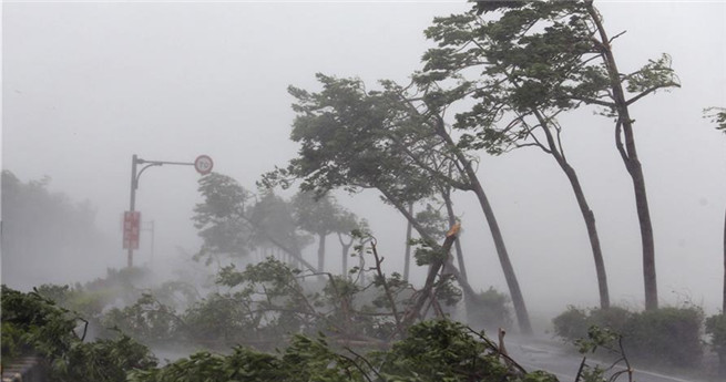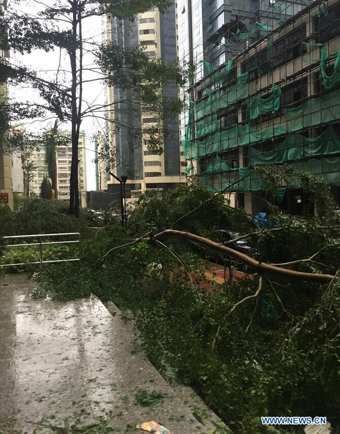 Ein vom Taifun umgestürzter Baum in der Stadt Xiamen in der südostchinesischen Provinz Fujian (Foto vom 15. September 2016). Taifun Meranti kam am Donnerstagmorgen in Xiamen an. (Xinhua/Zheng Jun)