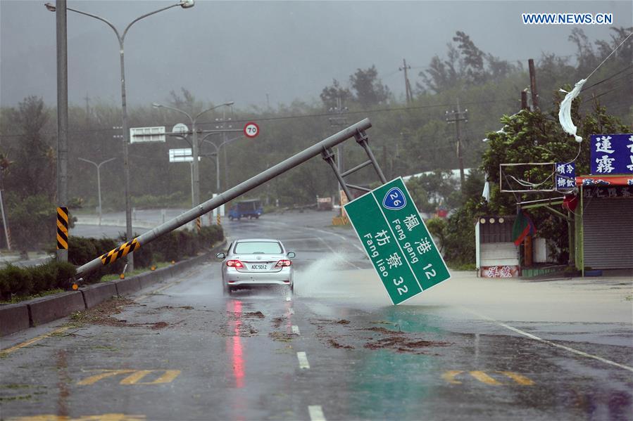 Ein Straßenschild wurde vom Taifun auf einer Autobahn von Pingtung nach Kenting in Taiwan zerstört.