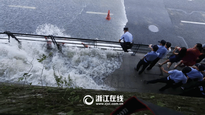 Gestern gegen 15 Uhr erreichten die Wellen einen Höhepunkt und die Flut strömte auf die Zhijiang-Straße. Die riesigen Wellen stiegen auf die Straße empor und verschluckten sie in nur wenigen Sekunden.