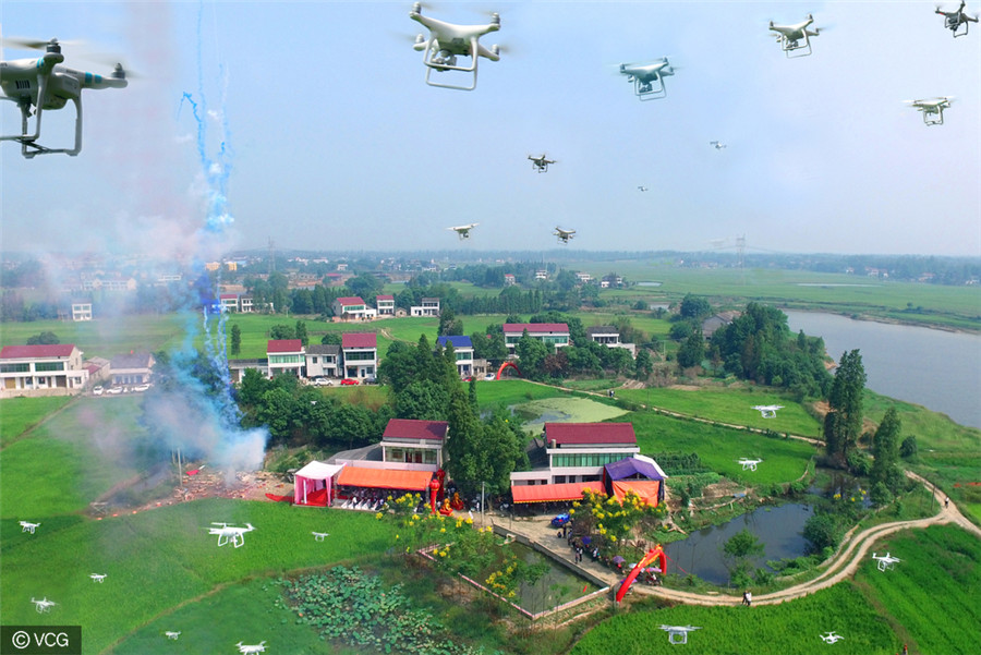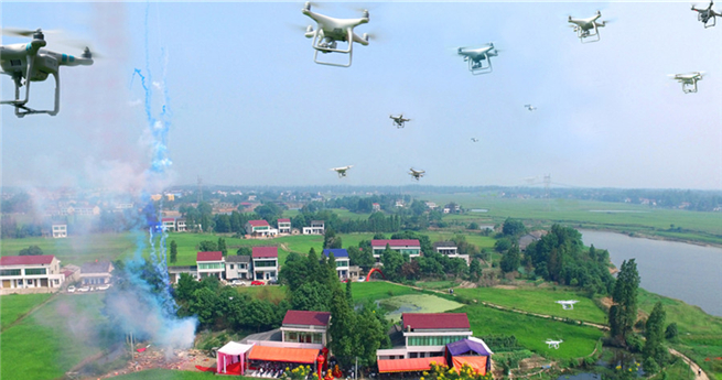 Diese großzügige Feier wurde in Jiaohe in der südchinesischen Provinz Hunan veranstaltet. Dazu wurde ein lokaler Verband der Flug-Liebhaber eingeladen. Vor dem Bankett ließen sie die ferngesteuerten Drohnen über dem Festplatz schweben, um die wichtigen Momente festzuhalten.